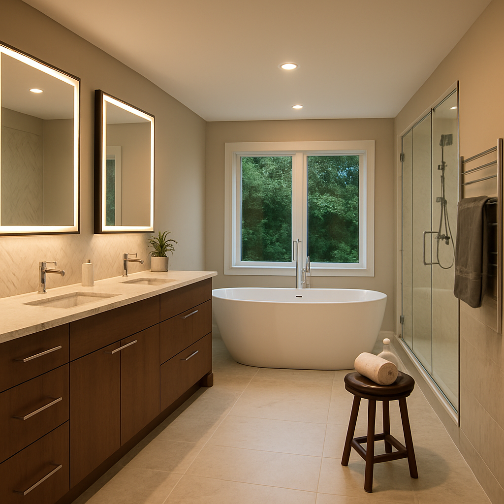 This budget is for a large primary ensuite or a project involving significant layout changes. It can include features like a custom double vanity, natural stone countertops and tile, a large curbless shower with frameless glass and multiple showerheads, a freestanding tub, in-floor heating, custom lighting, and high-end fixtures.